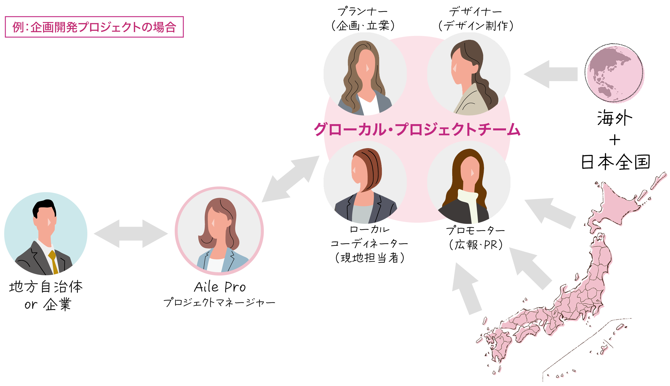 Aile Pro(エールプロ)は、女性に特化した人財プラットフォームです。海外在住(グローバル)メンバーと日本各地の地域(ローカル)メンバーがスキルや知見を掛け合わせ、「グローカル・プロジェクトチーム」を編成し、自治体・企業のプロジェクトを支援します。プロジェクト型支援に加え、ワーカーとの直接個別契約にも対応しています。